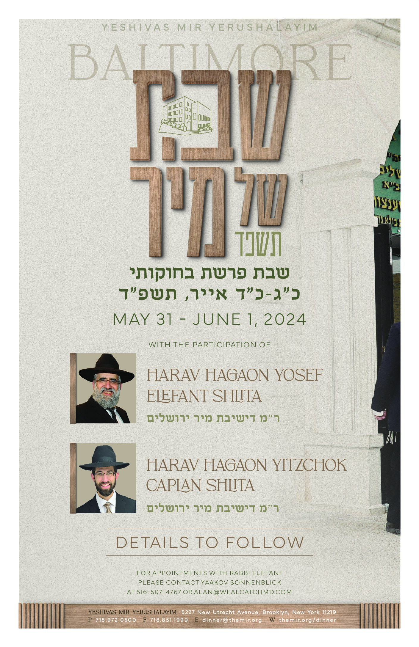 Baltimore Shabbos of Chizuk 2024 + Add to Google Calendar + iCal / Outlook export The event is finished. Tags: Yeshivas Mir Yerushalayim, Shabbos of Chizuk, baltimore Date May 31 2024 - Jun 01 2024 Expired! Category Events