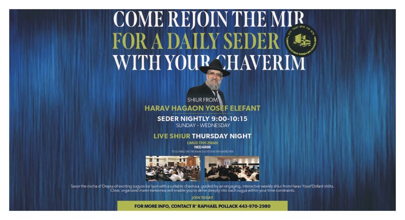 Come rejoin the Mir for a daily seder with your cheverim at…