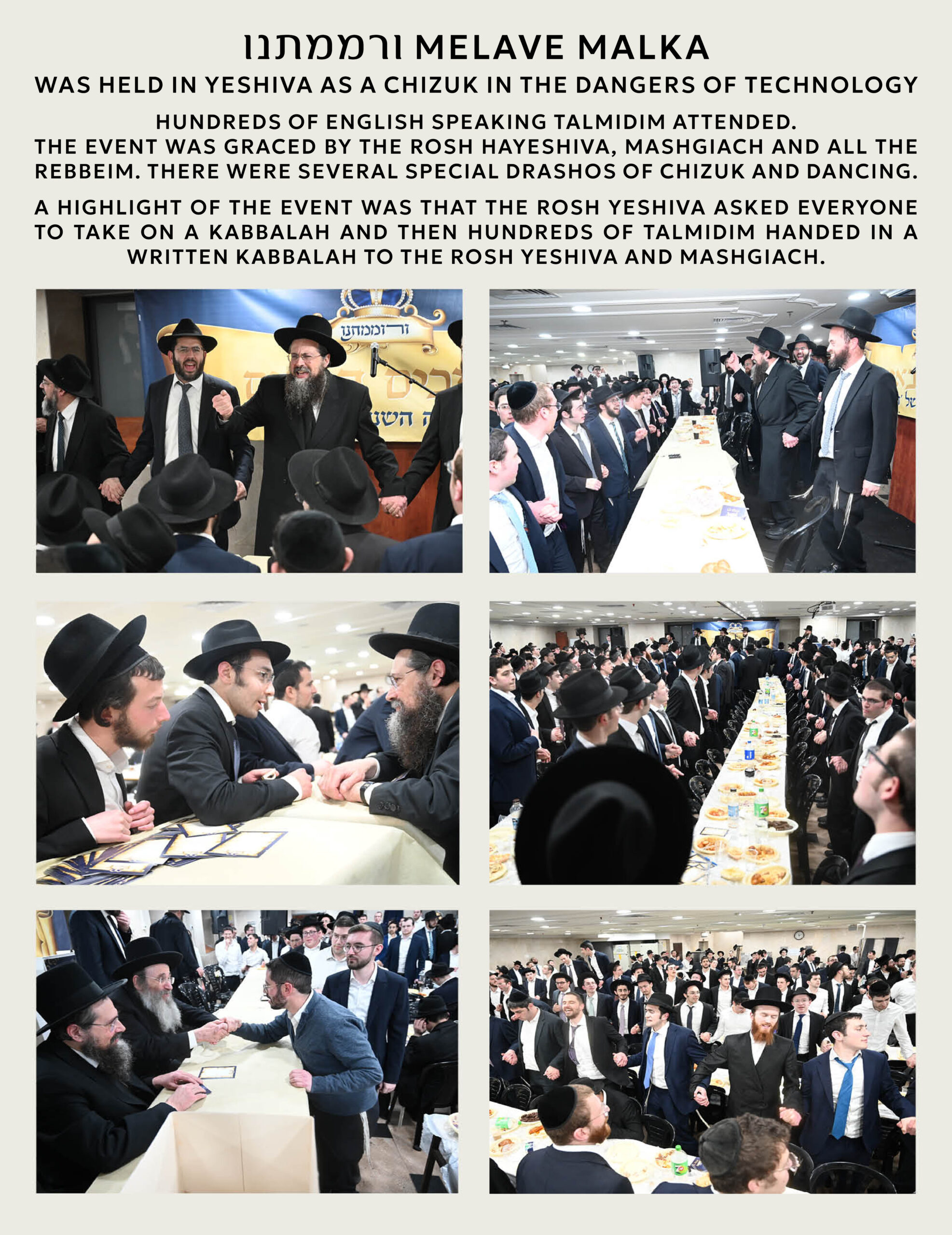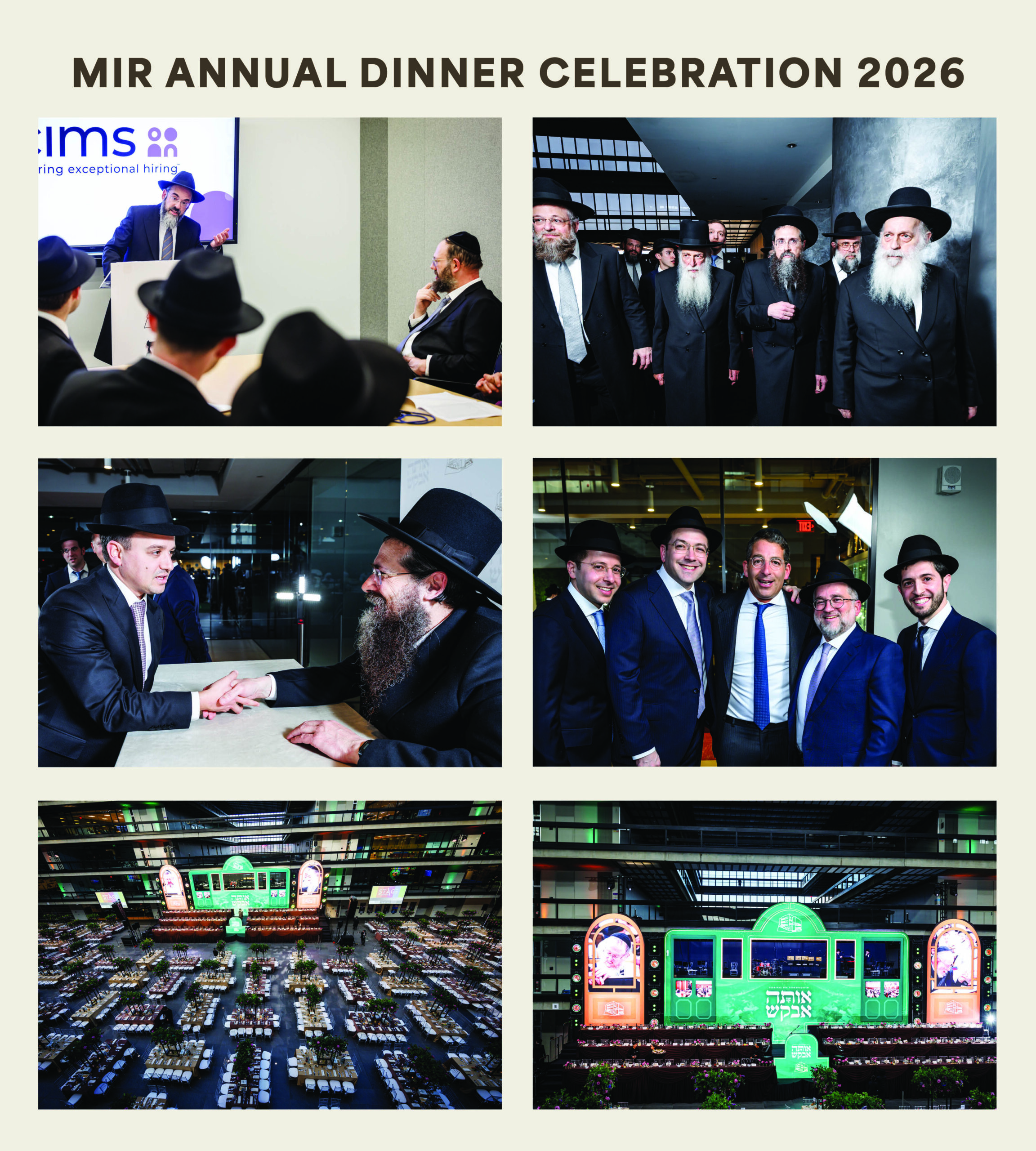 הונדערטער בוגרי וידידי הישיבה לעבן מיט גייסטרייכע שעות ביי גראנדיעזן דינער “גיבורי התורה” פאר “ישיבת מיר” אויסנאמליכע פראגראם מיט געשפאנטע דרשות און רייכע פרעזענטאציעס פולט אן דעם נאכט מיט תוכן און געשמאק מתחלה ועד סוף -געפאקטע זאל מיט “רעזערווירטע זיצן” שטרייכט ארויס דעם שעצונג פון די חשוב’ע…