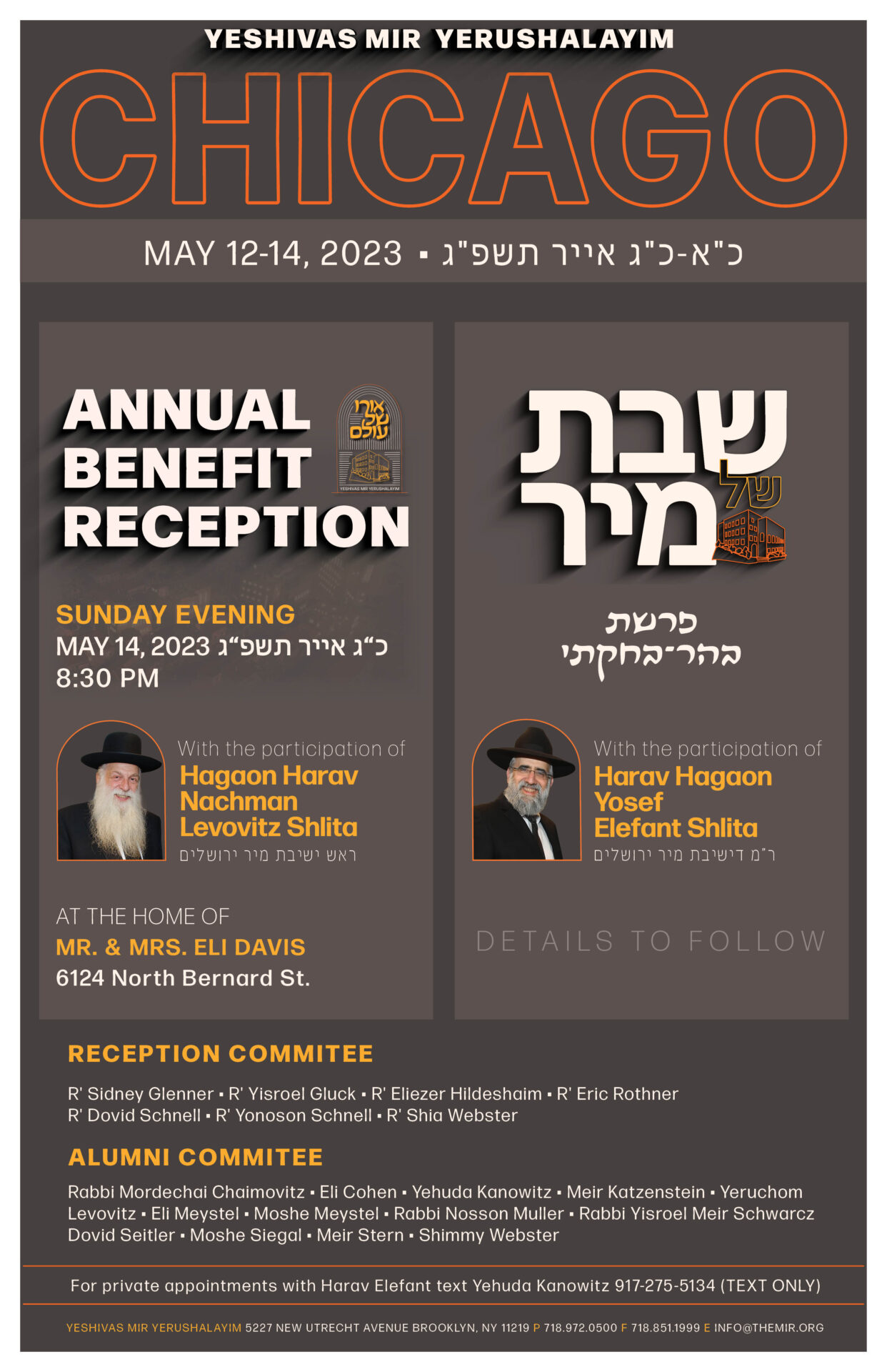 The Rosh Yeshiva, Hagaon Harav Nachman Levovitz Shlita and Harav Hagaon Rav Yosef Elefant Shlita infused the Chicago community with much chizuk and inspiration during the weekend of Shabbos Parshas Behar-Bechukosai. Rav Nachman struck a chord with the entire age spectrum – from veteran, longtime friends of the Mir to the younger, more recent alumni, who were the initiative behind this amazing visit – all of whom cherished the opportunity to reconnect with a vibrant link to the earlier Roshei Yeshiva and the legendary pre-war Mashgiach, Rav Yerucham Levovitz.