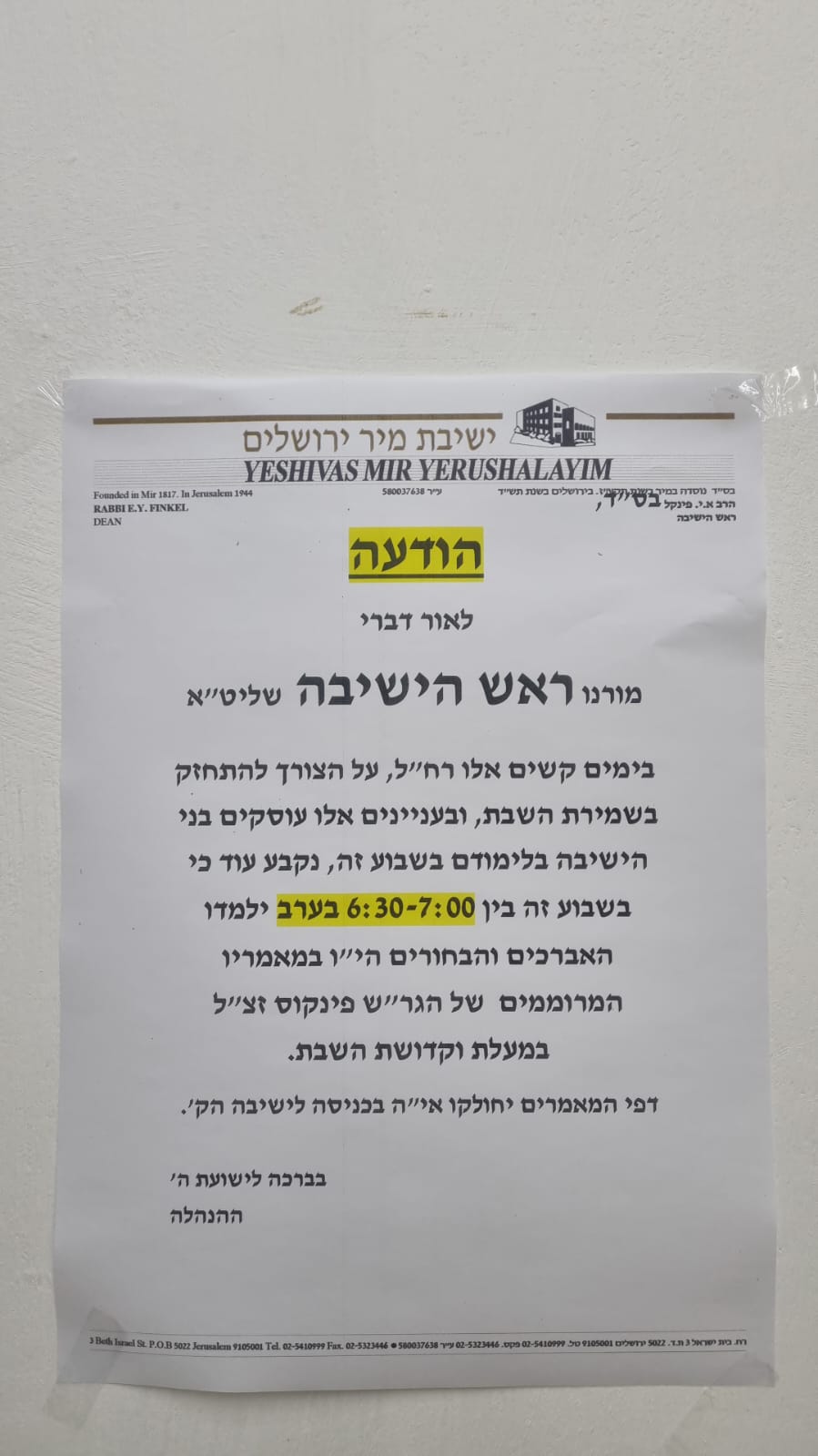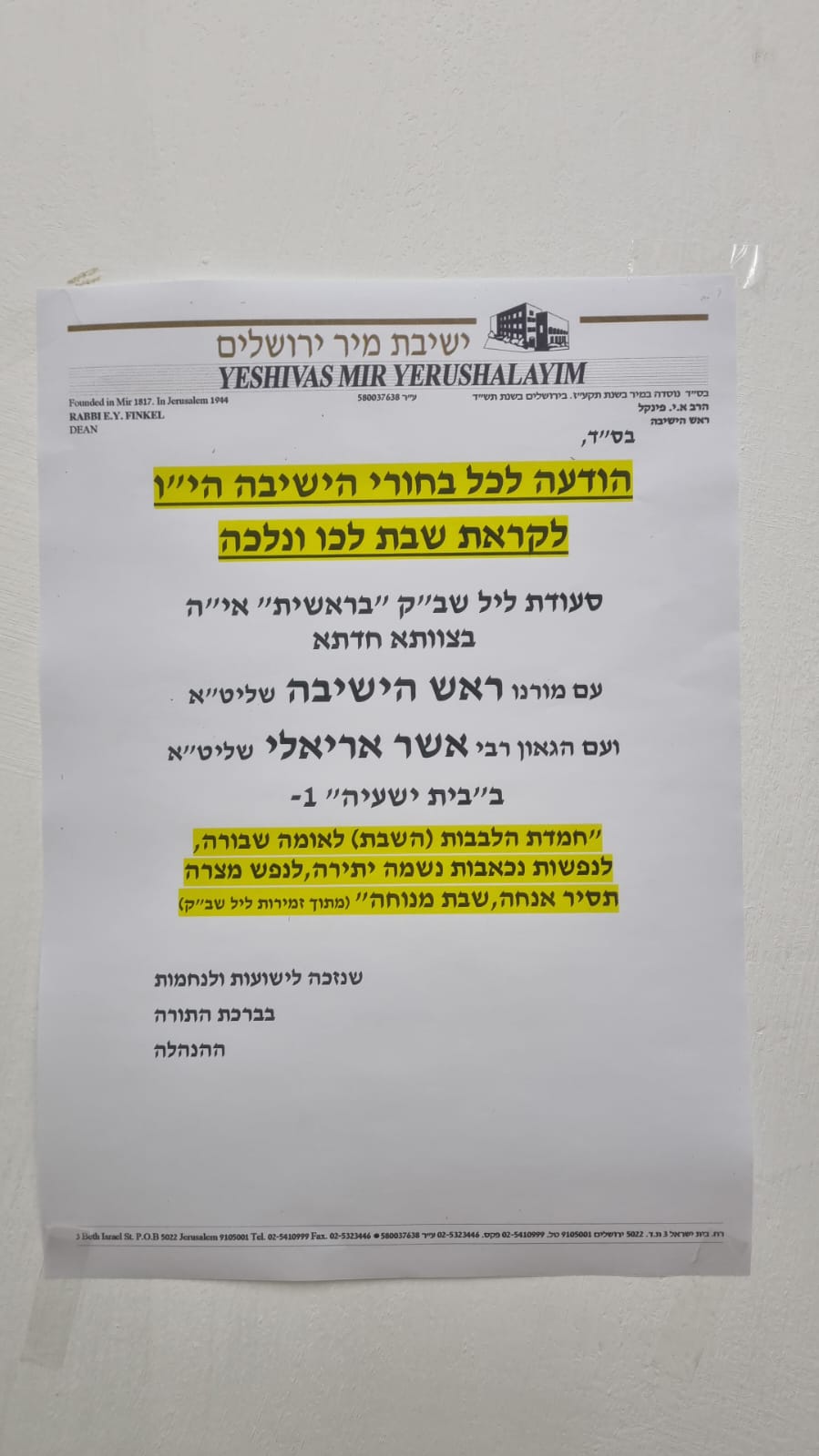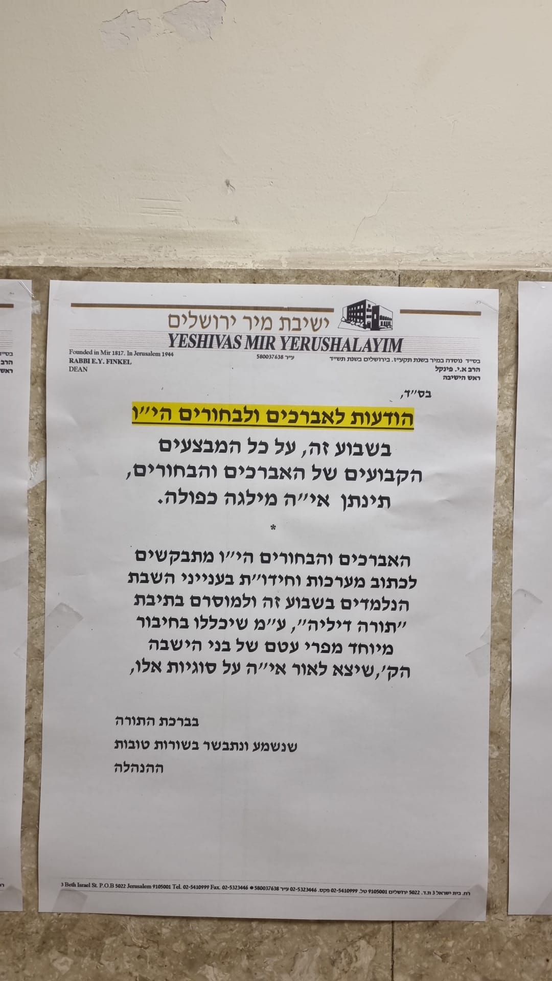 The Yeshiva is taking care of the families at home as well. The avreichim’s wives can listen to regular scheduled chizuk calls on a special hotline from Rebbetzin Finkel and other inspiring speakers.