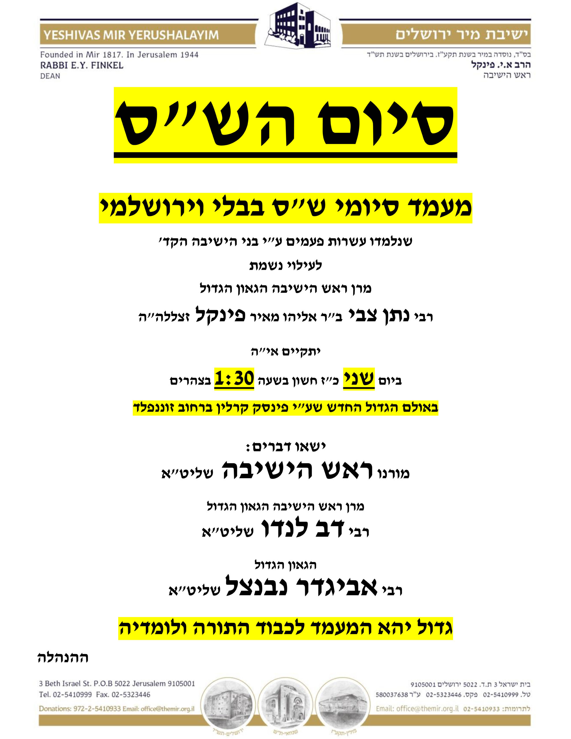 Speakers will include the Rosh Hayeshiva, Rav Dov Lando, Rav Avigdor Nebenzahl