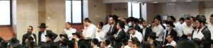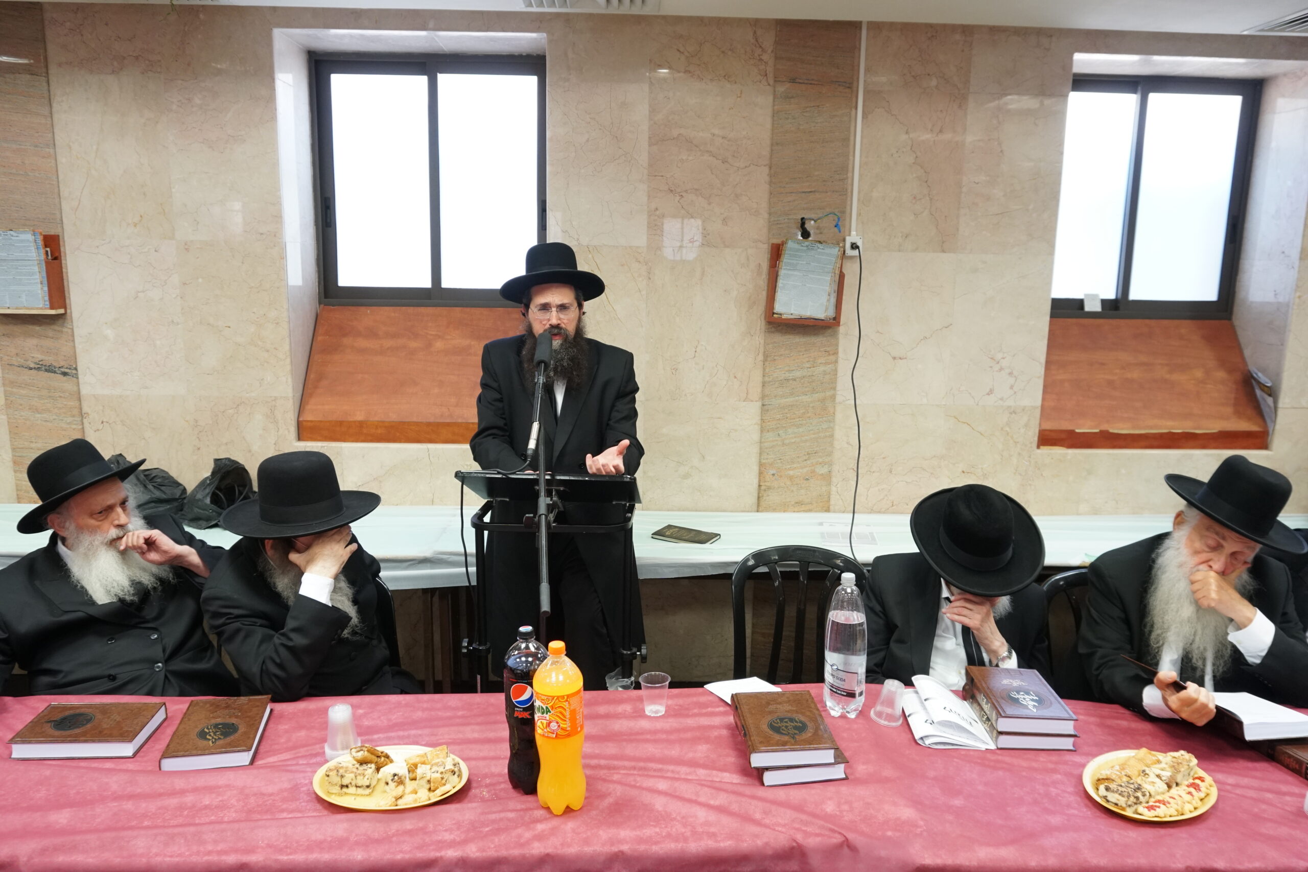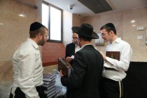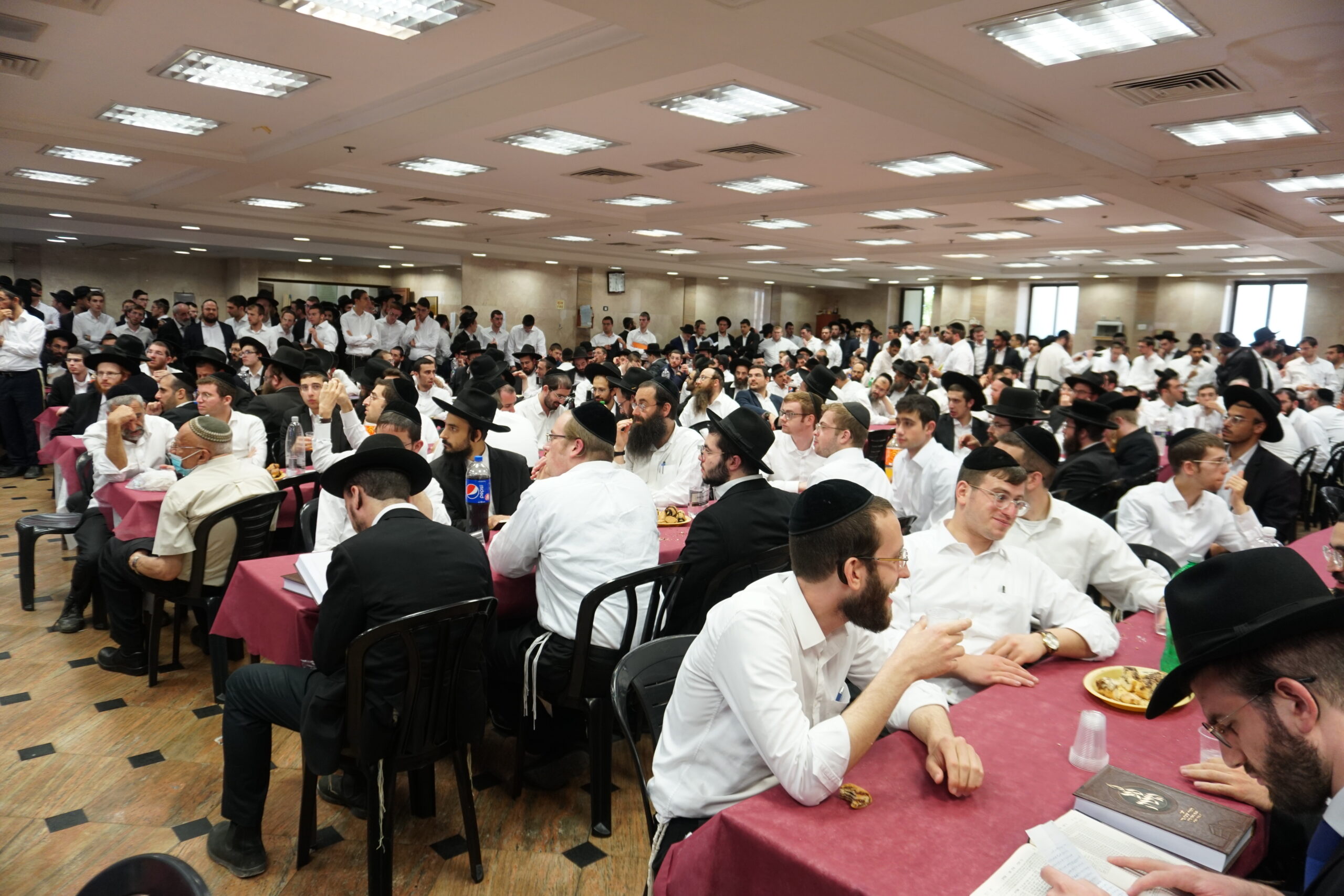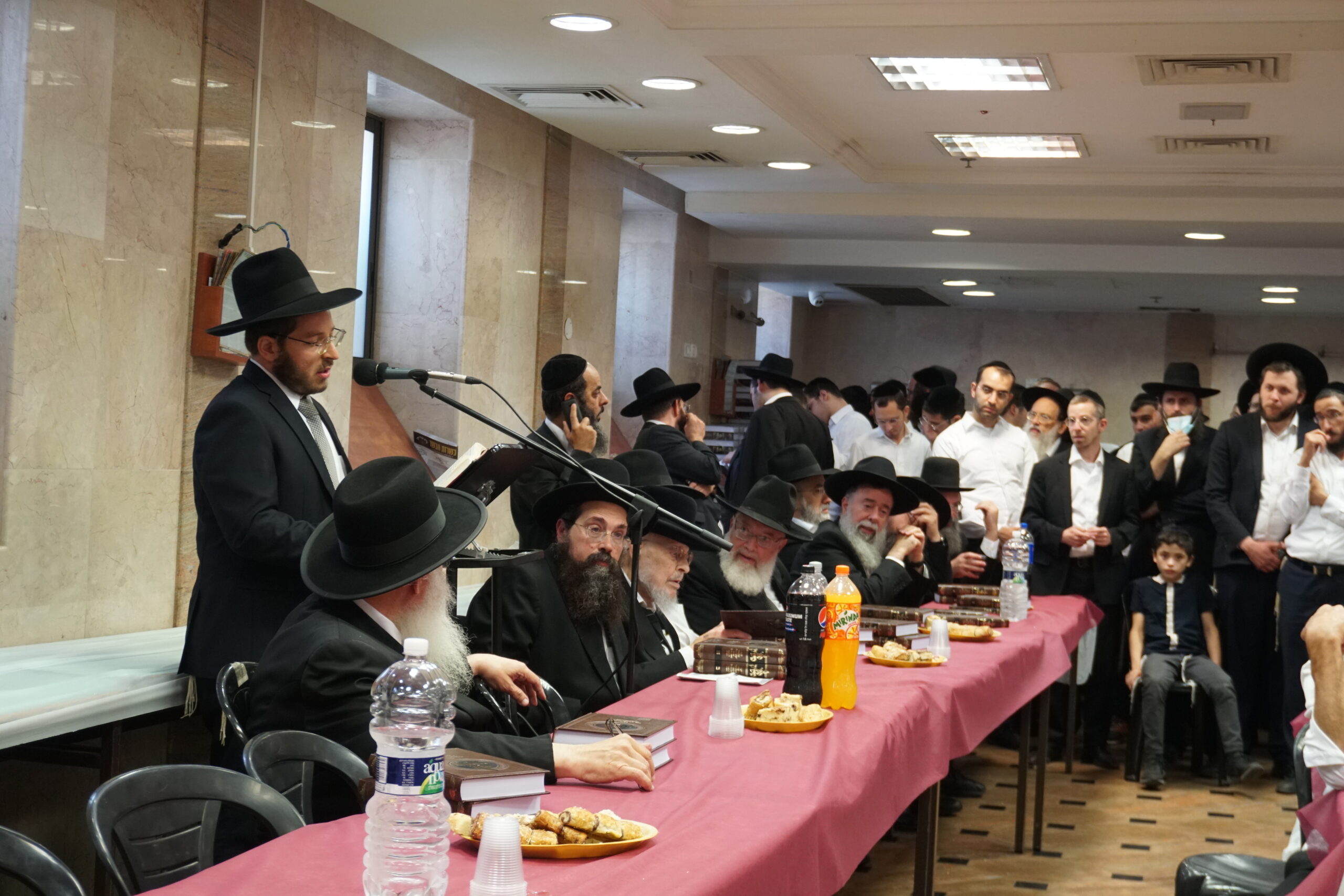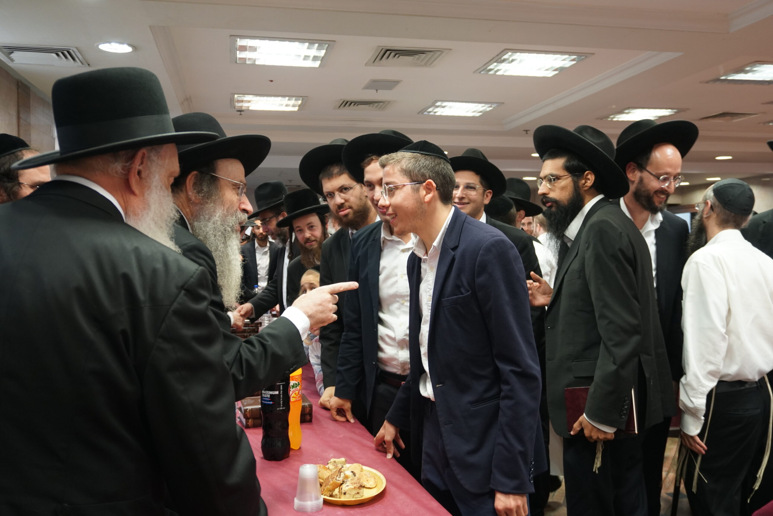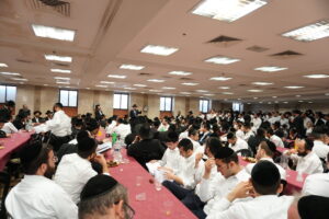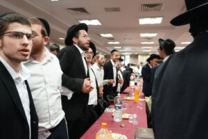 This past summer zman, the Yeshiva’s main Masechta was Pesachim. On the last day of the zman, members of the Daf Chabura – who schedule their learning with the goal of finishing the Yeshiva’s Masechta each zman – celebrated their customary siyum. They were joined by many other talmidim who independently arranged their learning schedule to complete the entire Masechta and were also mesayem at this event. Hundreds of talmidim were among the honorary mesaymim.