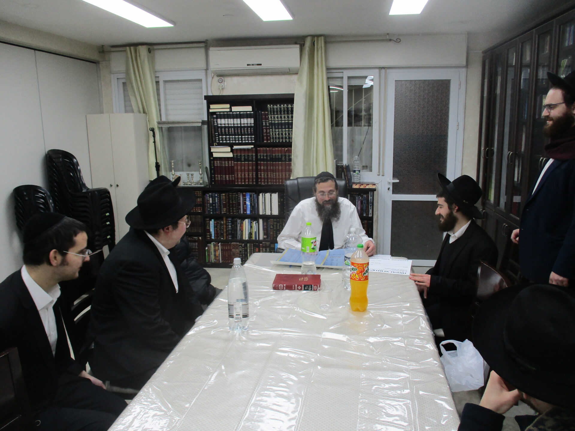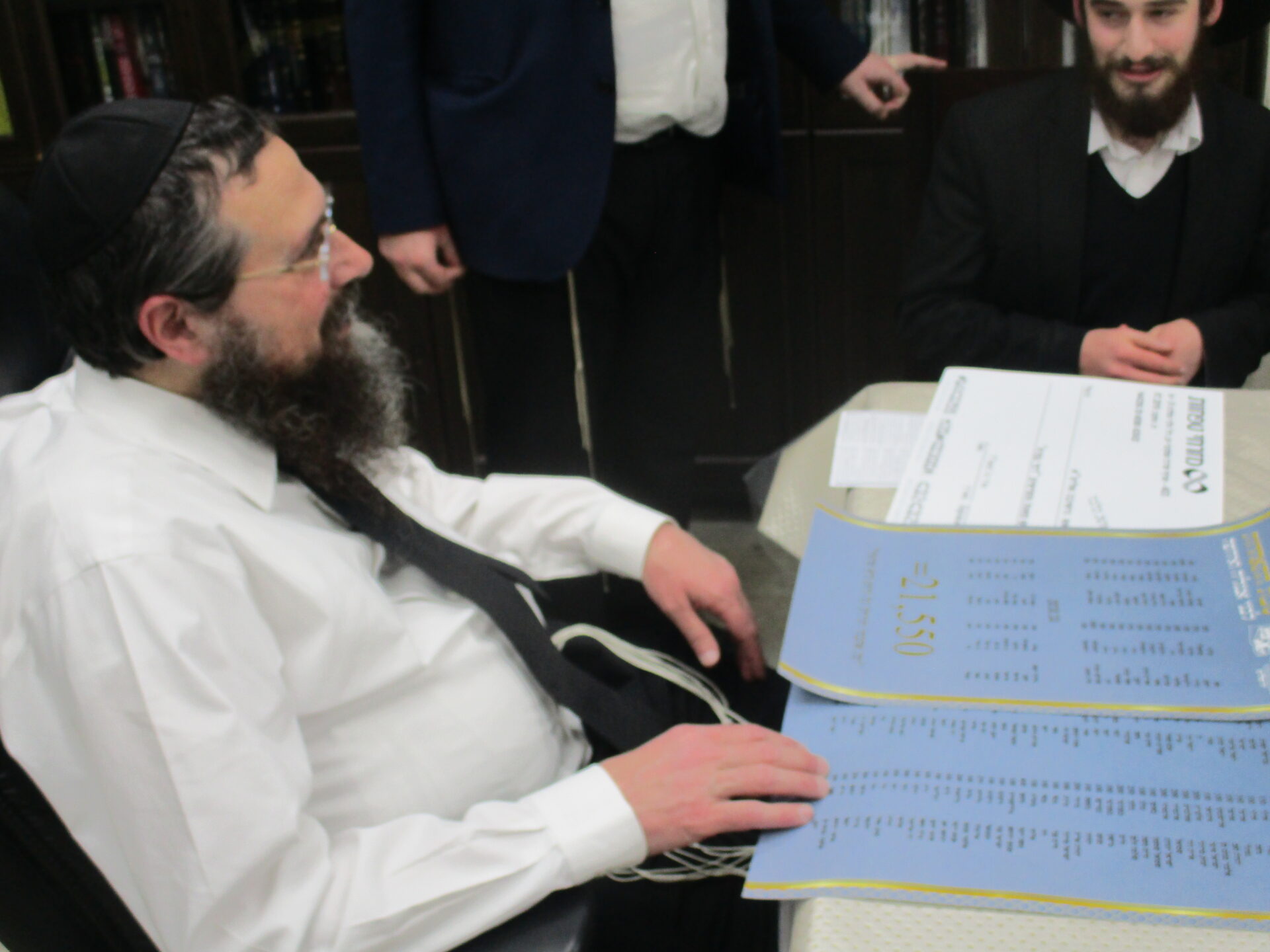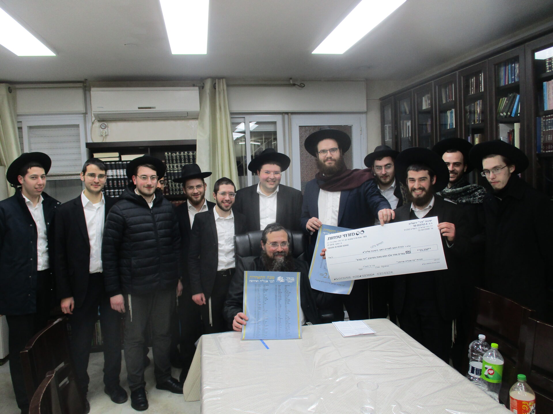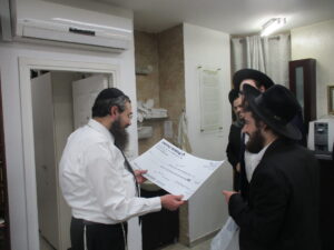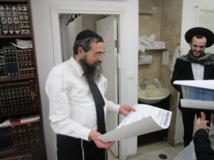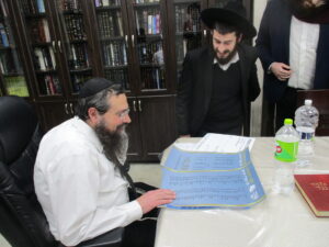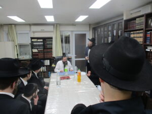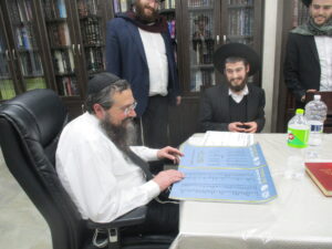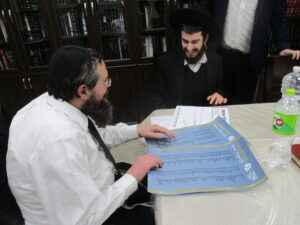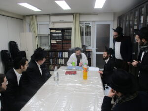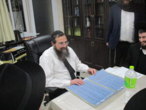 After spending a special Shabbos together with the Rosh Hayeshiva Shlita several weeks ago, the bnei chabura of the UK and European talmidim joined in presenting the Rosh Hayeshiva with a special gift signifying their hakoras hatov. While there aren’t many gifts the Rosh Hayshiva would enjoy, they knew exactly what to give. The group of over one hundred talmidim presented the Rosh Hayeshiva with a check – but instead of it being made out to a monetary amount, it was for a total of 21,550 dapim of Gemara that the talmidim took upon themselves to learn. The Rosh Hayeshiva was beaming with excitement – there is nothing more meaningful to him then more Limud Hatorah. Upon hearing that some of the bochurim committed themselves to over 500 blatt of Gemara, the Rosh Hayeshiva said that he will sponsor the necessary Gemaros they will need to complete it. It was a true simchas haTorah at the home of the Rosh Hayeshiva, as well as a beautiful demonstration of hakoras hatov in a most meaningful fashion.