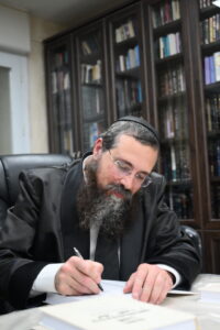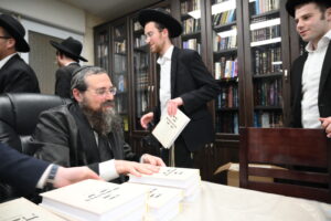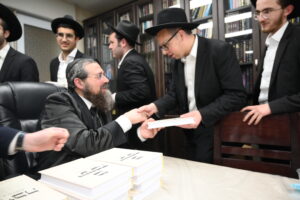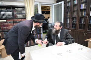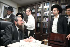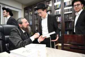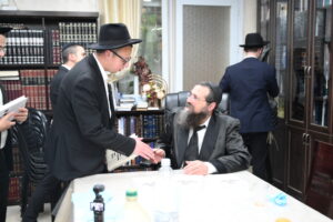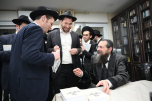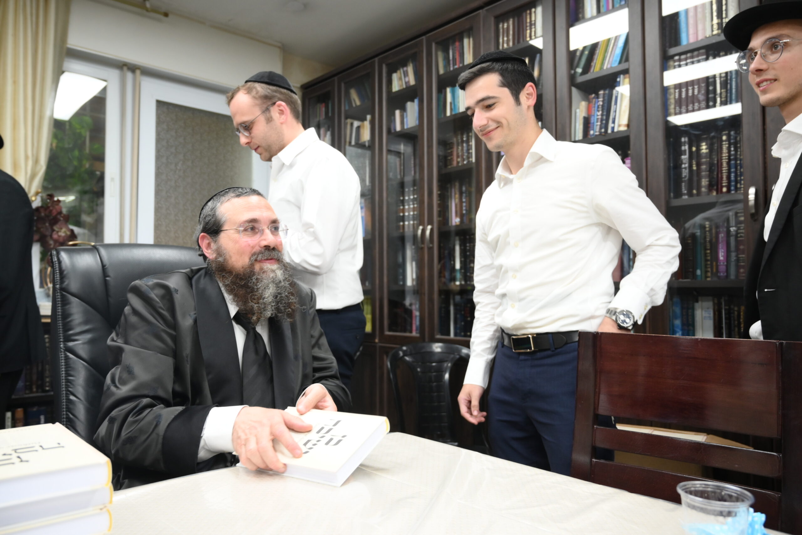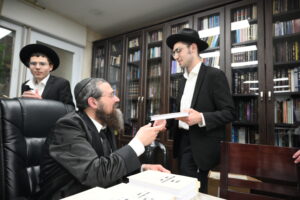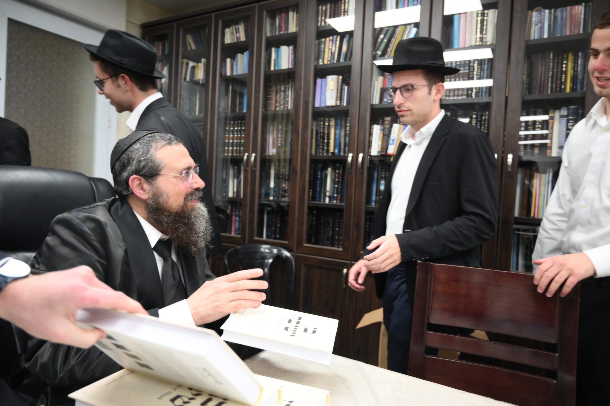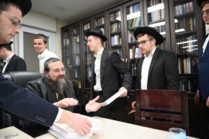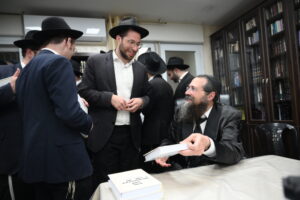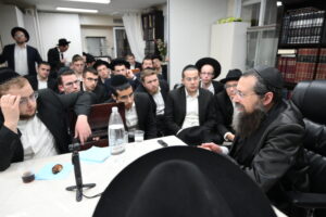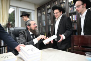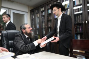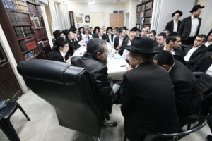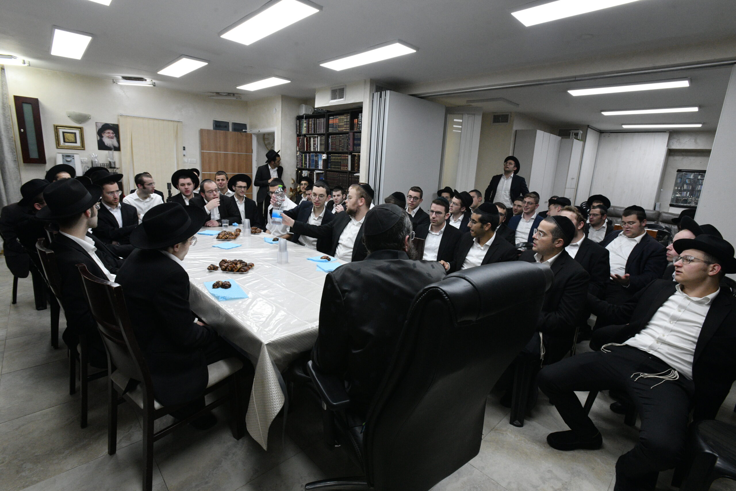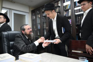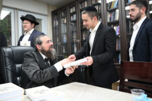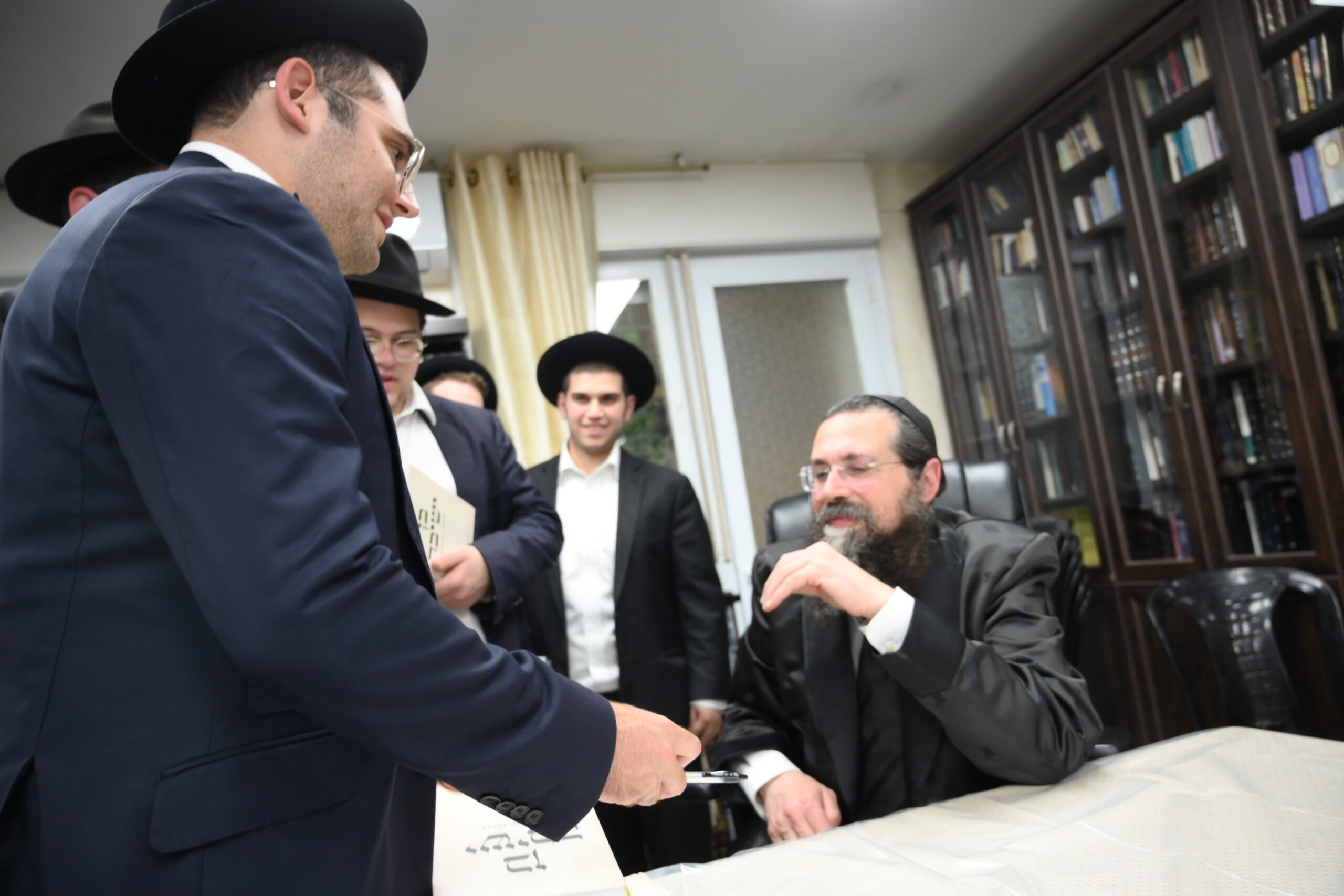 The 12 hour chabura had an asifas chizuk during the Aseres Yimei Teshuva at the home of the Rosh Hayeshiva Shlita. There are over 70 bochurim Bnei Chutz Laaretz who have committed to learning 12 hours a day. At the end of the asifa they each received a gift from the Rosh Hayeshiva.
